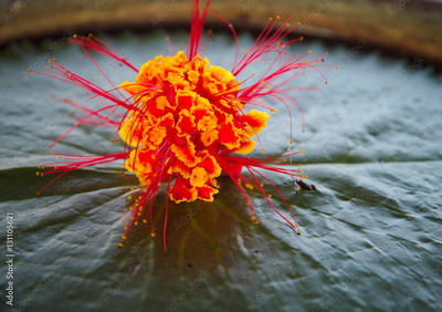 orange peacock flower decoration with water lily leaf