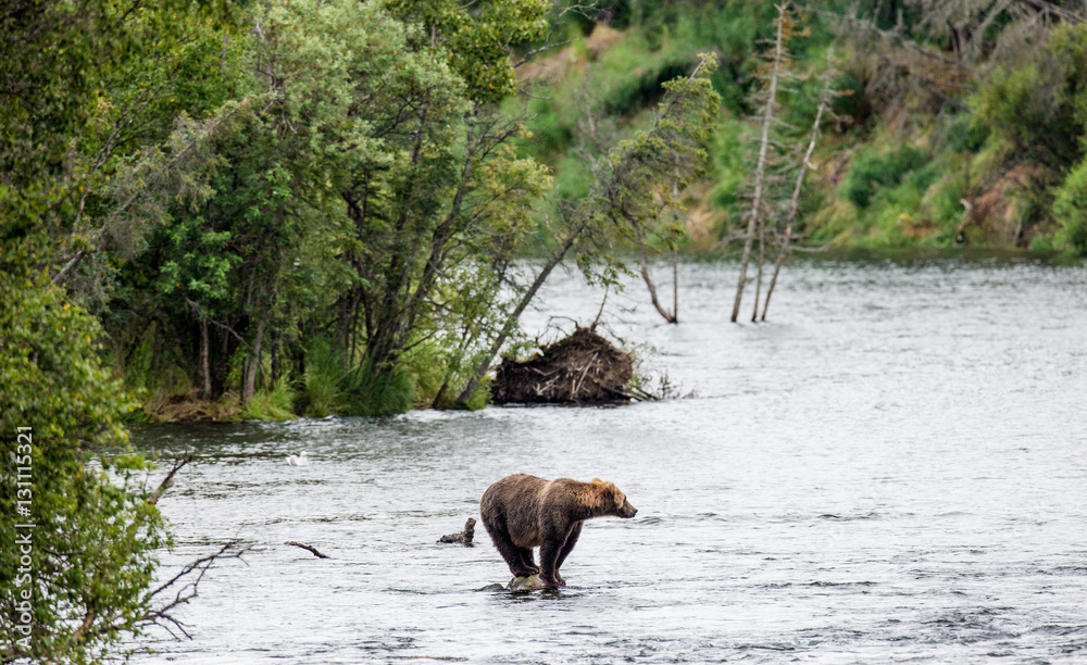 Brown bear standing on a rock in the middle of the river on a background of stunning landscape. USA. Alaska. Katmai National Park. An excellent illustration.