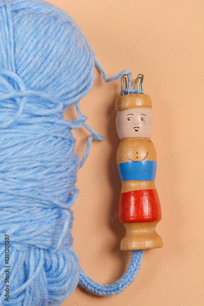 A wooden knitting doll with metal hooks, placed beside a skein of blue wool, displayed against a beige background