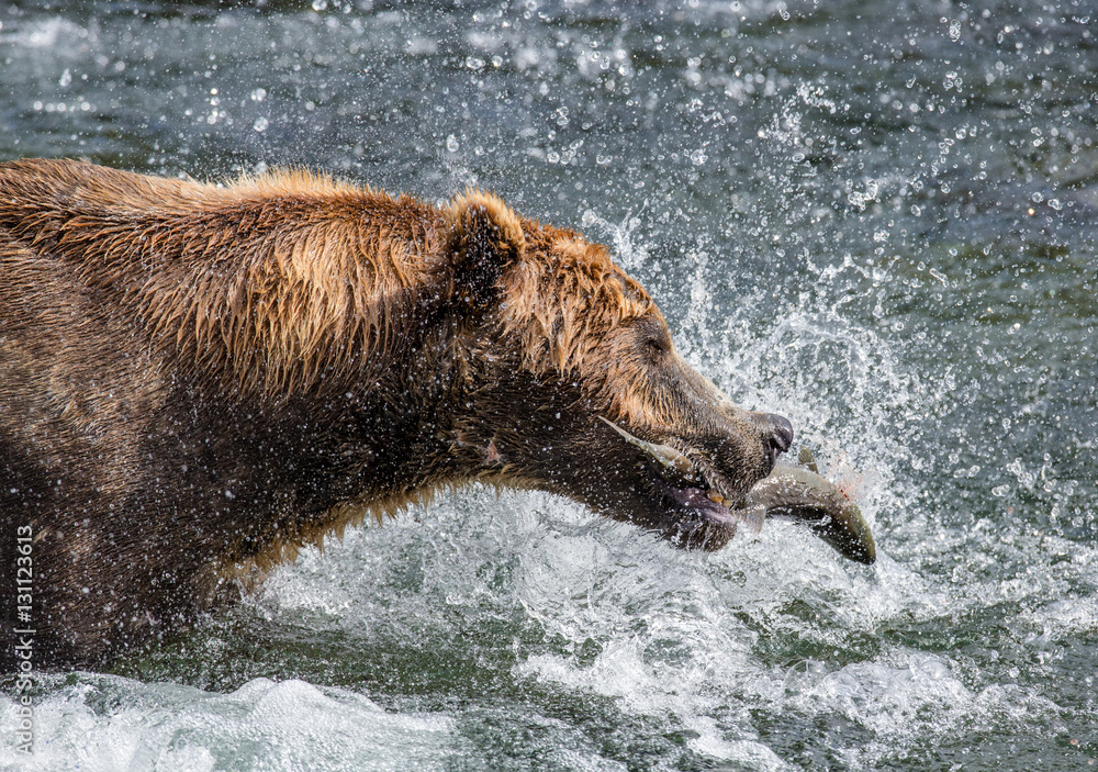 Brown bear catches a salmon in the river. USA. Alaska. Katmai National Park. An excellent illustration.