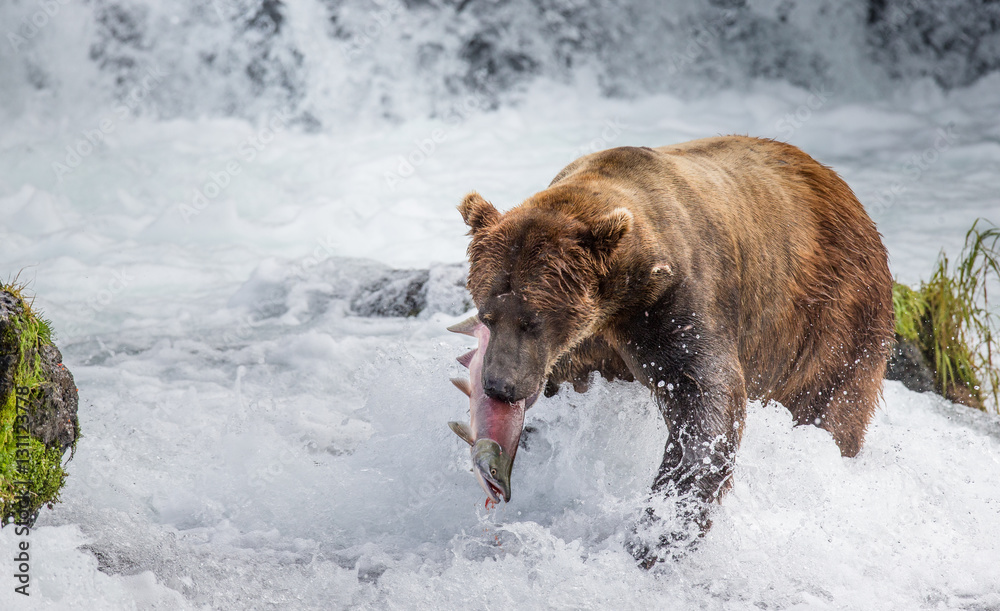 Brown bear catches a salmon in the river. USA. Alaska. Katmai National Park. An excellent illustration.