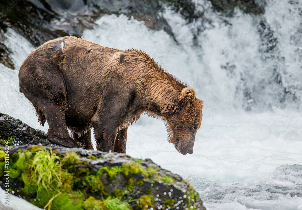 Brown bear standing on a rock in the middle of the river on a background of stunning landscape. USA. Alaska. Katmai National Park. An excellent illustration.