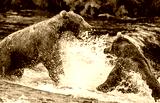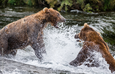 Two brown bears fighting for a place on the river for fishing. USA. Alaska. Katmai National Park. An excellent illustration.