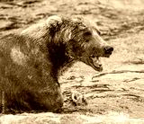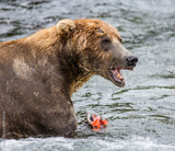 Brown bear eating salmon in the river. USA. Alaska. Katmai National Park. An excellent illustration.