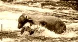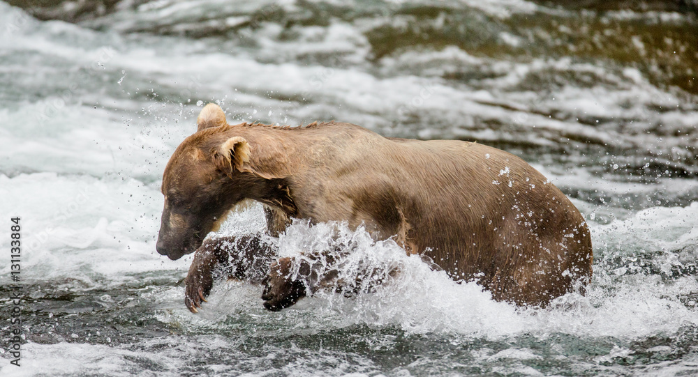 Brown bear catches a salmon in the river. USA. Alaska. Katmai National Park. An excellent illustration.