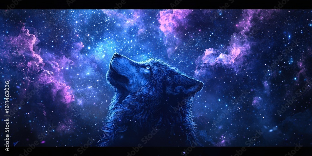 A majestic wolf with deep blue-purple fur looms against a star-studded night sky, its eyes glowing with an ethereal light, embodying the wild beauty of the nocturnal wilderness