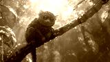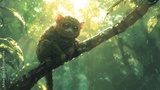 A tarsier perches delicately on a moss-covered branch within a vibrant, emerald-green forest, surrounded by dappled sunlight. The scene exudes an enchanting natural beauty. (134 characters)