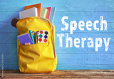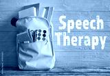 School backpack with stationery and text SPEECH THERAPY on blue wooden background