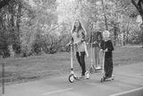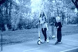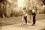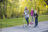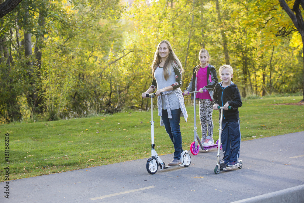 Family riding together outdoors on a paved bike pathway. Family is smiling and having fun together at a outdoor nature park