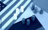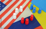 United States, Russian and Ukranian flags and different people figures. Negotiations and relationship between USA, Russia and Ukraine.