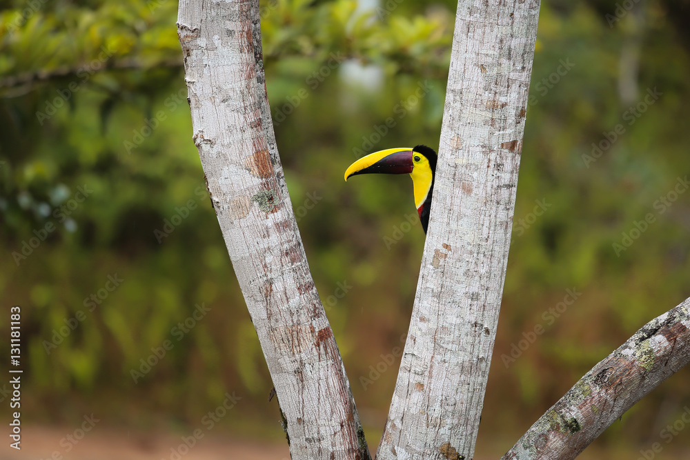 Braunrückentukan in Costa Rica schaut hinter Baumstamm hervor