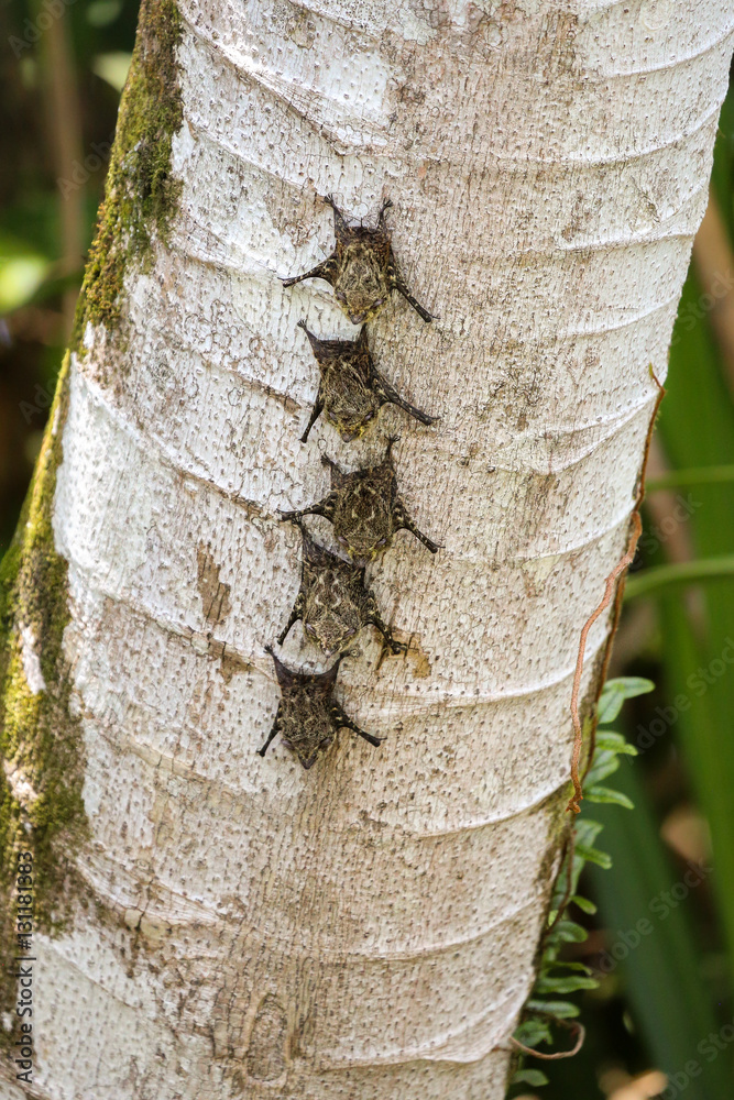 Gruppe Blütenfledermäuse an einem Baumstamm in Costa Rica