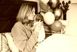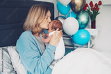 After baby delivery mother and baby at home. Mother holds her newborn in hands. Mom and baby together. Childbirth and motherhood concept. Family celebrates birth of baby boy.