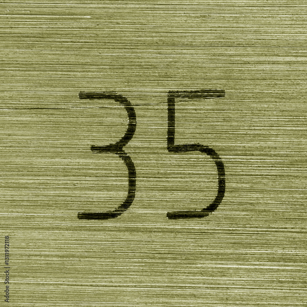 Scratched golden numbers 35 or thirty five on a piece metallic panel. Abstarct numeral background.