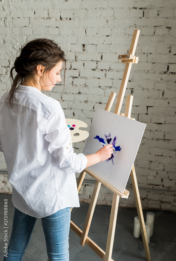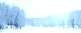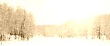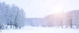 A birch grove after a snowfall on a winter near a frozen lake. Sunlight breaking through the clouds. Panorama.