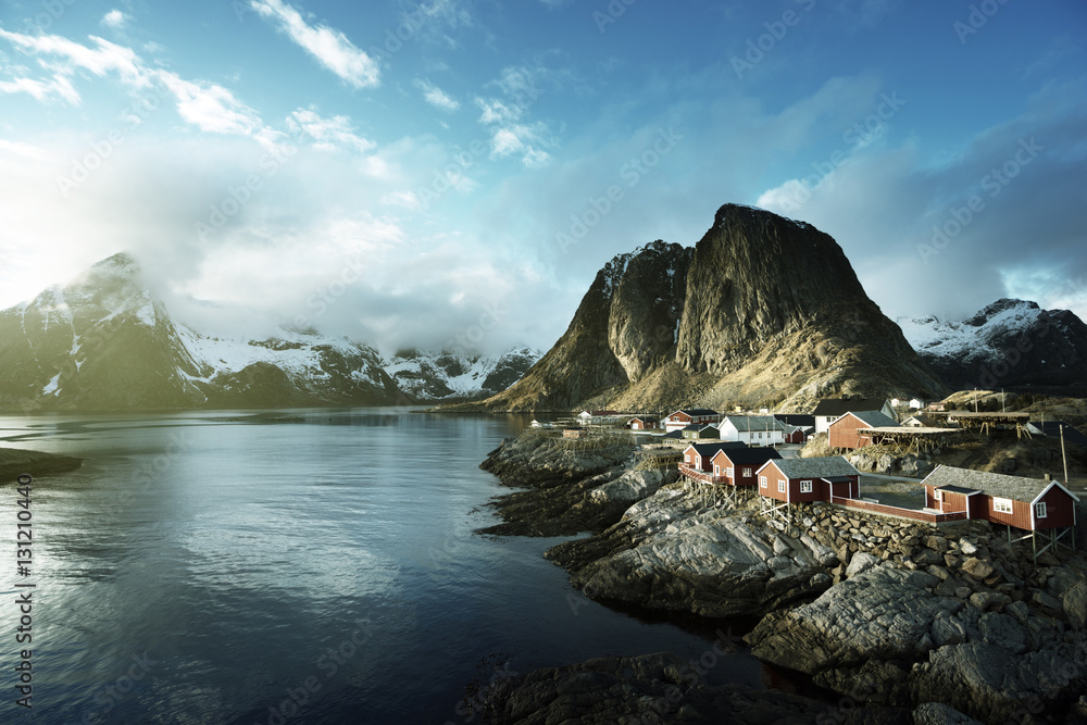 Fishing hut at spring sunset - Reine, Lofoten islands, Norway