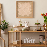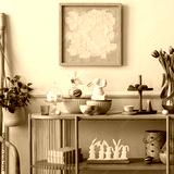 Interior design of spring living room interior with mock up poster frame, glass vase with tulips, wooden sideboard, hare sculpture, bowl, ladder, and personal accessories. Home decor. Template