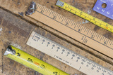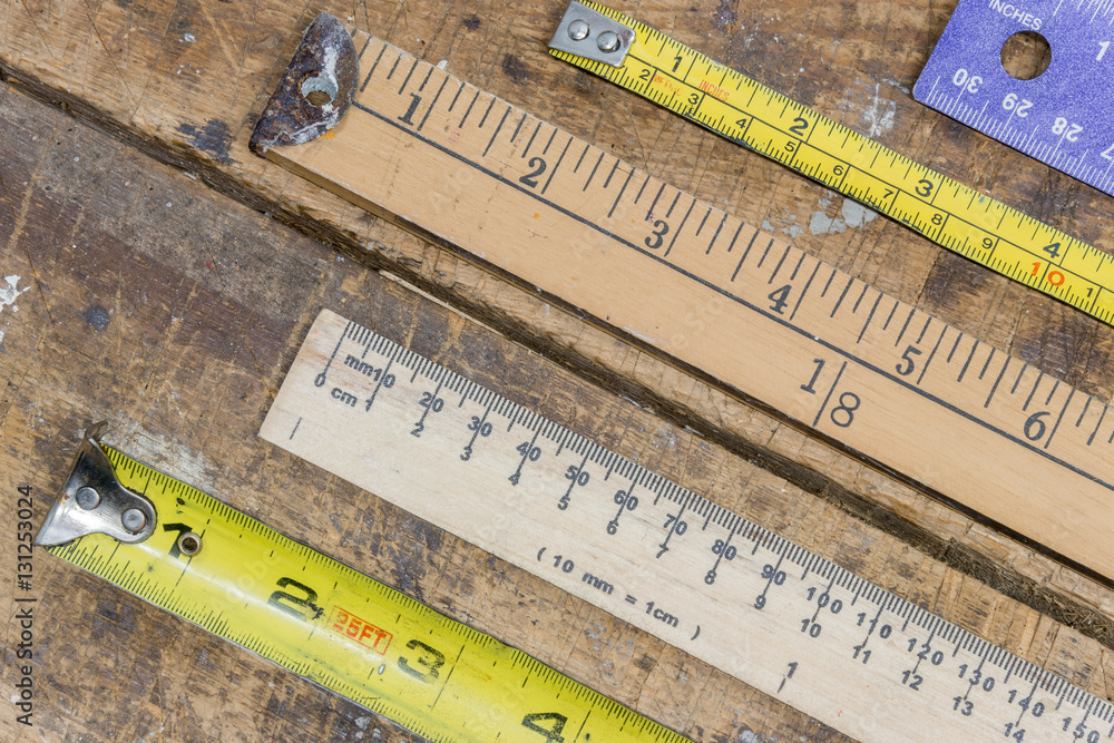 Various measuring sticks, rulers, tape measures on scratched wor