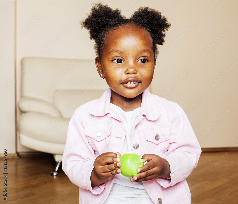 little cute african american girl playing with animal toys at ho