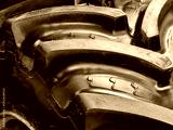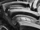 Wheels of agricultural machinery showcasing intricate tread patterns in a field setting during a sunny afternoon