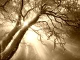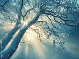 Sun rays through snow-covered tree branches in winter forest.
