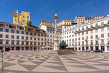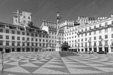Rossio Square with its patterned pavement, baroque column and surrounding historic buildings under a clear blue sky, Lisbon