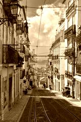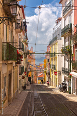 A steep cobbled street with tram tracks in the Bica district of Lisbon, Portugal