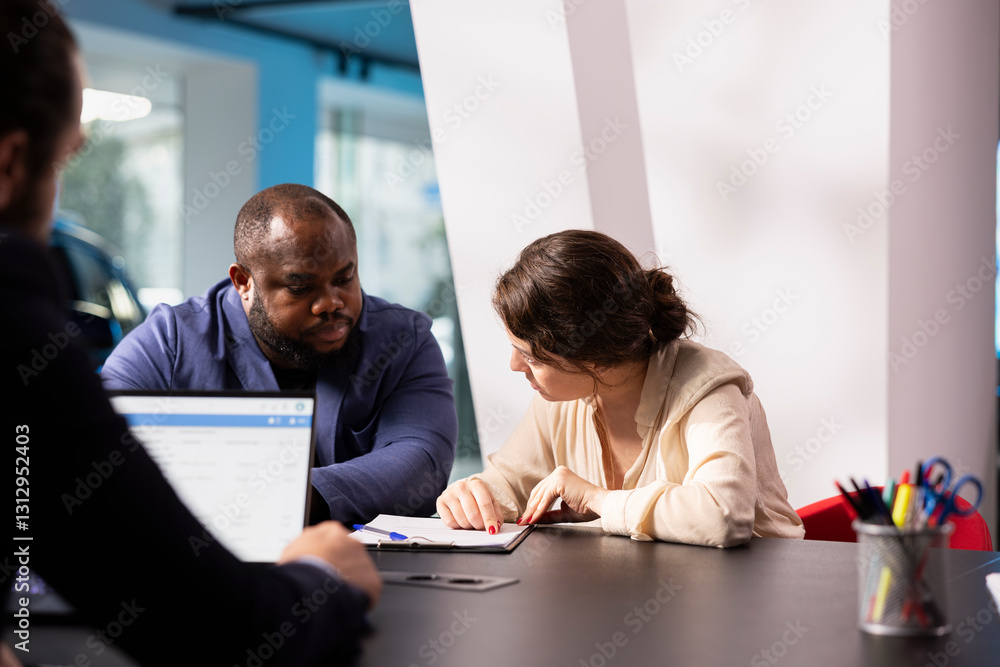 Car sales executive helping couple make decision when choosing what type of vehicle to invest in. Showroom worker assisting husband and wife in selecting the right automobile during consultation