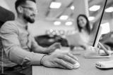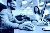 Close up of hand working with computer mouse at car showroom.