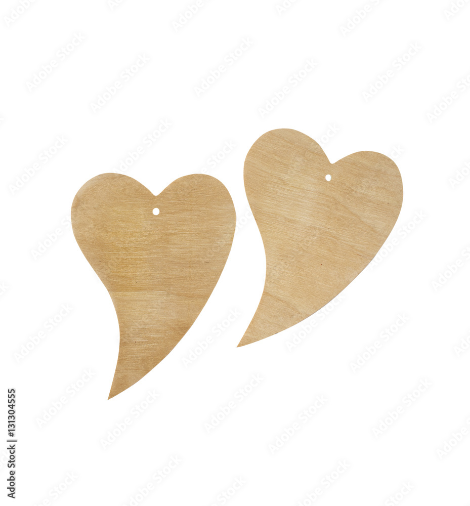 Two wooden hearts isolated on white background. Top view. Valentines days. Love symbol.