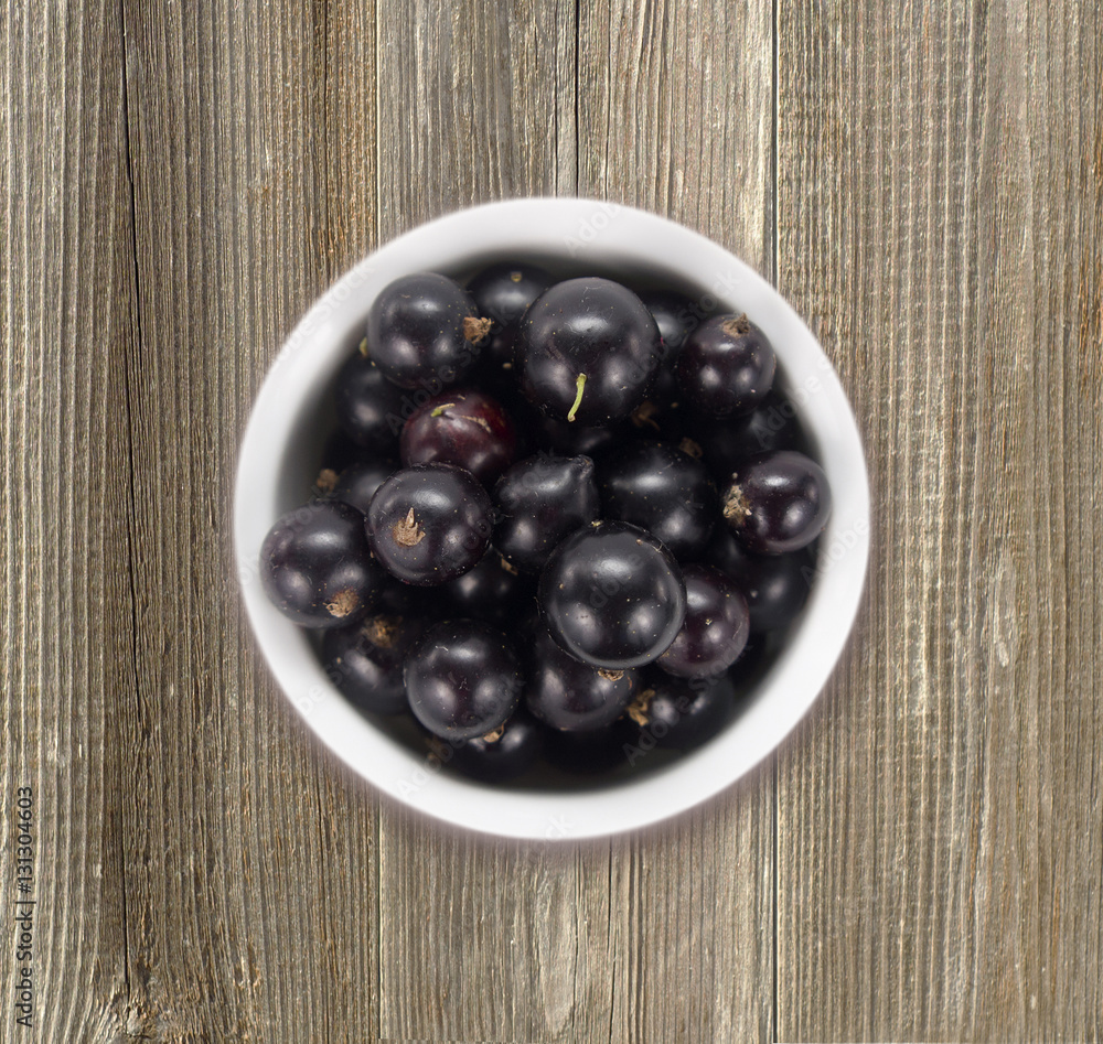 Black currants in a white ceramic bowl. Top view. Ripe and tasty currants on a wooden background.