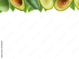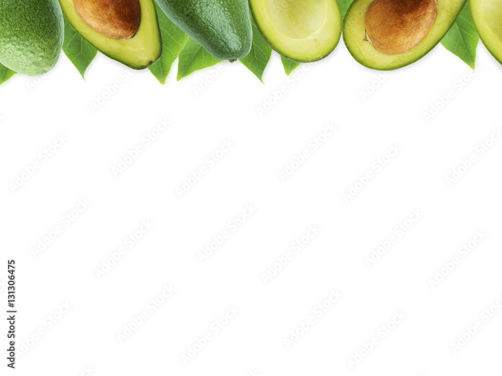 Fresh avocado with leaves on white background. Halves of fresh avocado at border of image with copy space for text. Top view. Vegetarian or healthy eating.