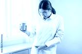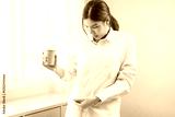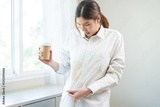 Cloth stain, disappointment asian young woman clumsy with hot coffee, tea stains on shirt, hand show making spill drop on white shirt, spot dirty or smudge on clothes at home, isolated on background