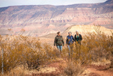 Three adult women hiking together in a desert landscape on a warm winter day. Enjoying the sun and the great outdoors while exercising and staying active