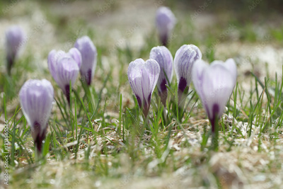 White crocuses on sparkling snow background, beautiful spring flowers. Easter and Mother's Day card template.