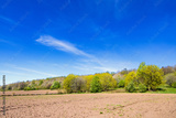 Cultivated land with bare soil and lush green trees a sunny spring day in the countryside