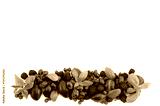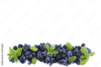 Group of fresh fruits and berries at border of image with copy space for text. Ripe blueberries, grapes, plums and blackberries on a white background.
