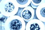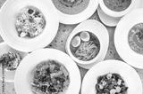 A variety of colorful dishes arranged on white plates. The table includes pasta, salads, soups, and more, showcasing diverse culinary presentations and vibrant ingredients.