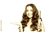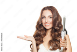 Good-looking woman with healthy long wavy hair holding empty palm hand and using curlyng iron, fashion beauty portrait