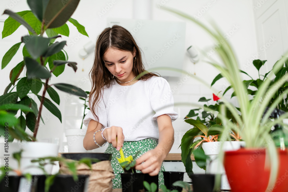 Gardener teen girl pulls out a houseplant from an old pot for transplanting