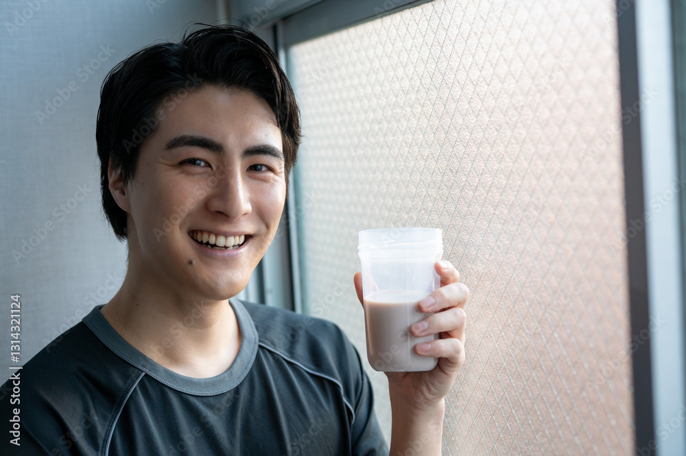 窓際でプロテインを持つ日本人男性
