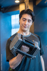 ダンベルで筋トレをする日本人男性