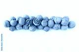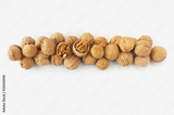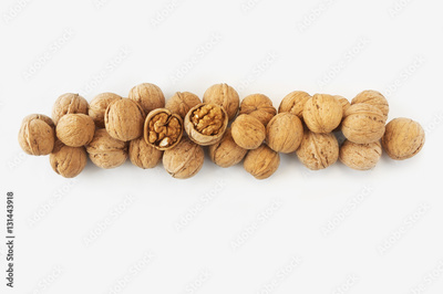 Walnuts on white background. Walnuts at border of image with copy space for text. Top view. Vegetarian or healthy eating.