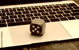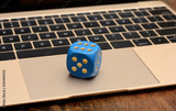Blue Dice on Laptop Keyboard close up