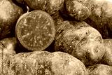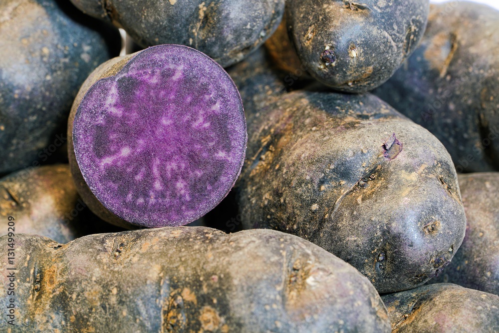 Kartoffeln der Sorte Vitelotte auf einem Tisch