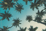 Vintage toned tropical palm trees at summer, view from ground up to the sky