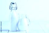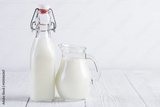 Jar with milk and vintage bottle of milk on white wooden table background still life