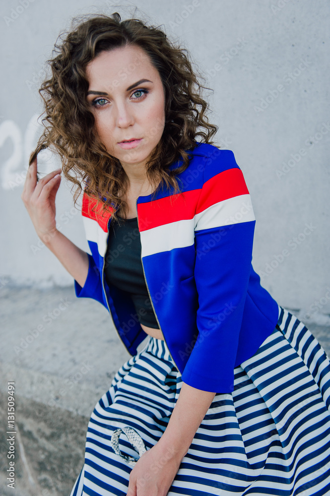 Beautiful sexy young brunette girl with long wavy hair thin slender figure and pretty face make-up wearing a long stripped skirt and black top, high heels. Walk on the street in casual style