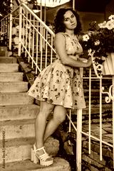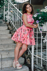 Beautiful brunette girl posing in pink dress outside near tropical plants