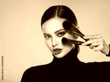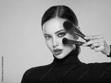 Portrait of a girl with cosmetic brush near face. Woman making makeup on the face using makeup brush. One half face of a beautiful white woman with bright makeup and the other is natural.